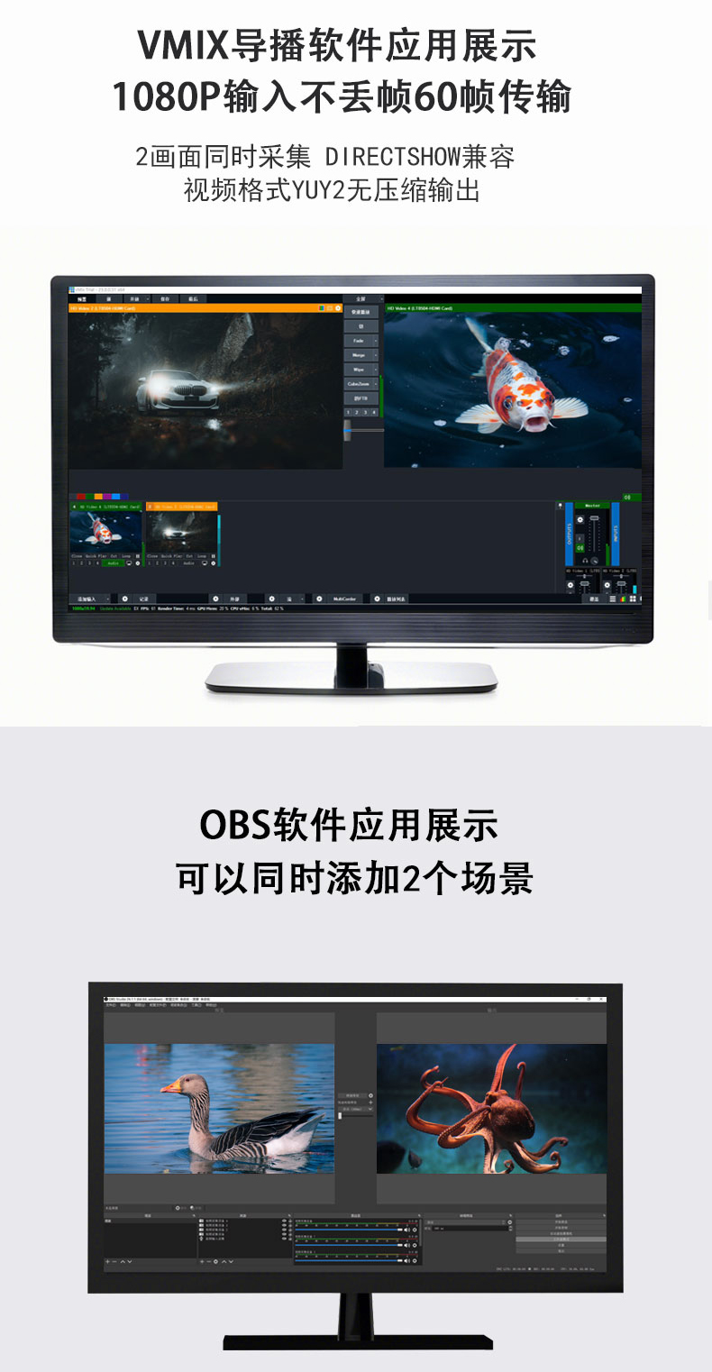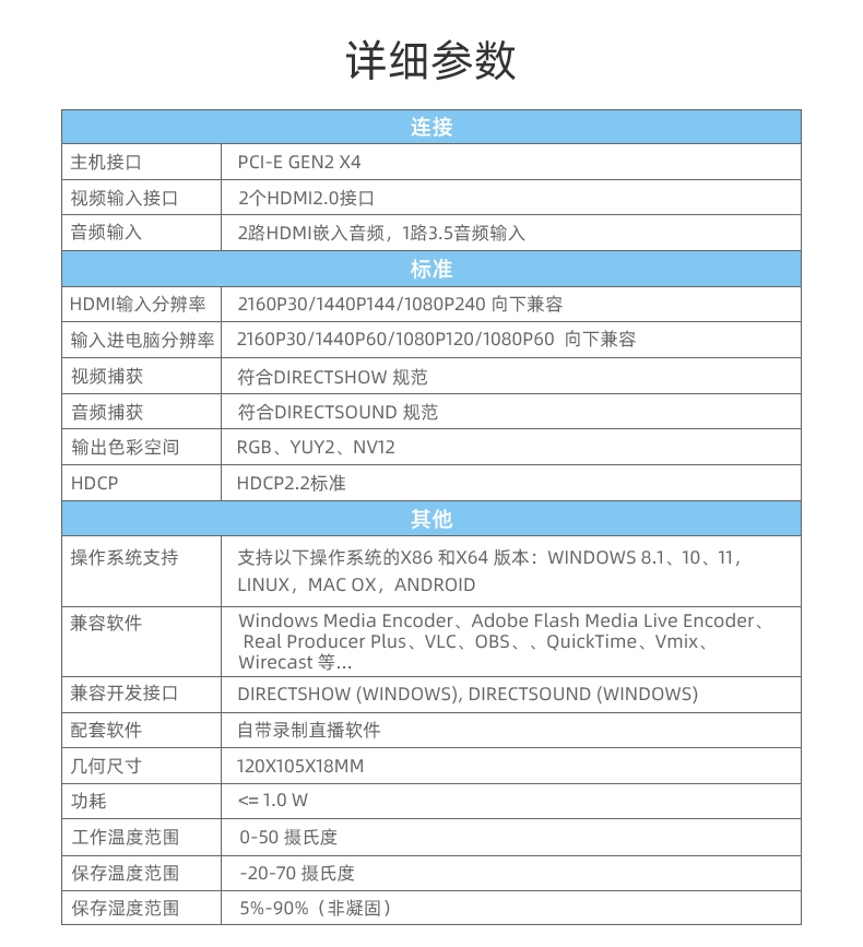 产品说明:最高同时支持2路4K(3840*2160 30HZ)输入,进电脑支持4K(3840*2160 30HZ),2路HDMI可同时采集输入,电脑识别2路设备,PCI-X X4插槽,支持X16
