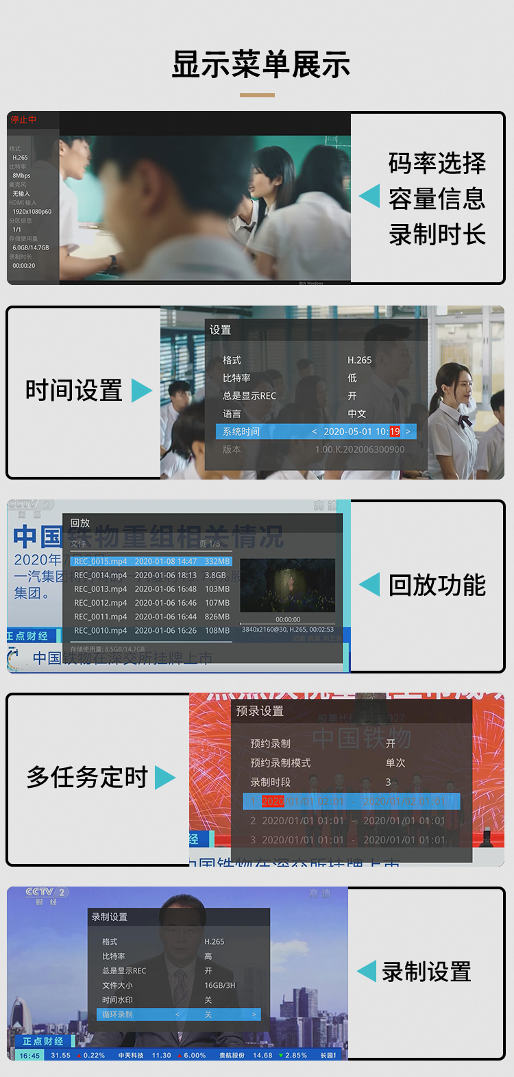 产品说明:新款九音九视JS3090高清视频录制盒,H.265编码,4K输入录制,多任务定时,U盘/移动硬盘存储和电脑采集可同时,可选2G/4G/16G分段存储,更人性化、更专业、更简单