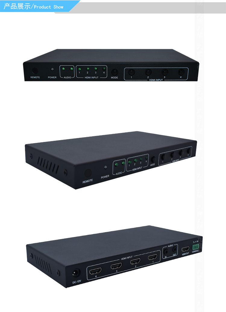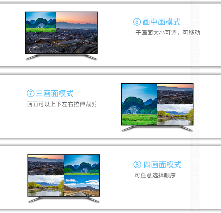 产品说明:4路HDMI接口,输出支持4K60hz,支持多种模式,左右模式上下模式的时候可对画面进行拉伸裁剪实现画面不变形,子窗口算法更新,效果更好、文字更清晰...