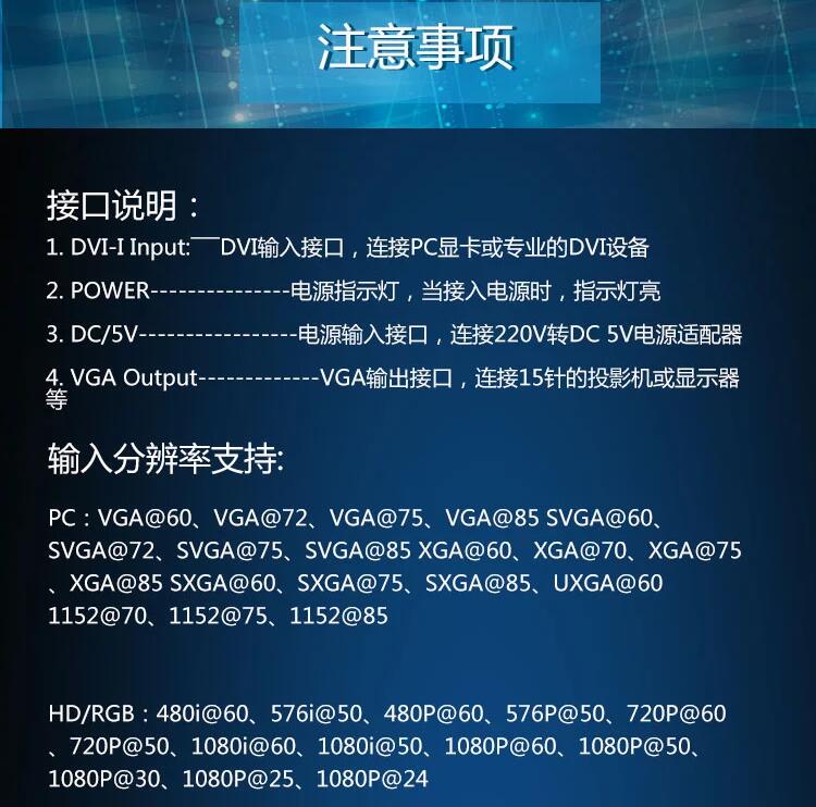 1、连接带有DVI-D接口的电脑和模拟信号(VGA)显示器或VGA接口设备。